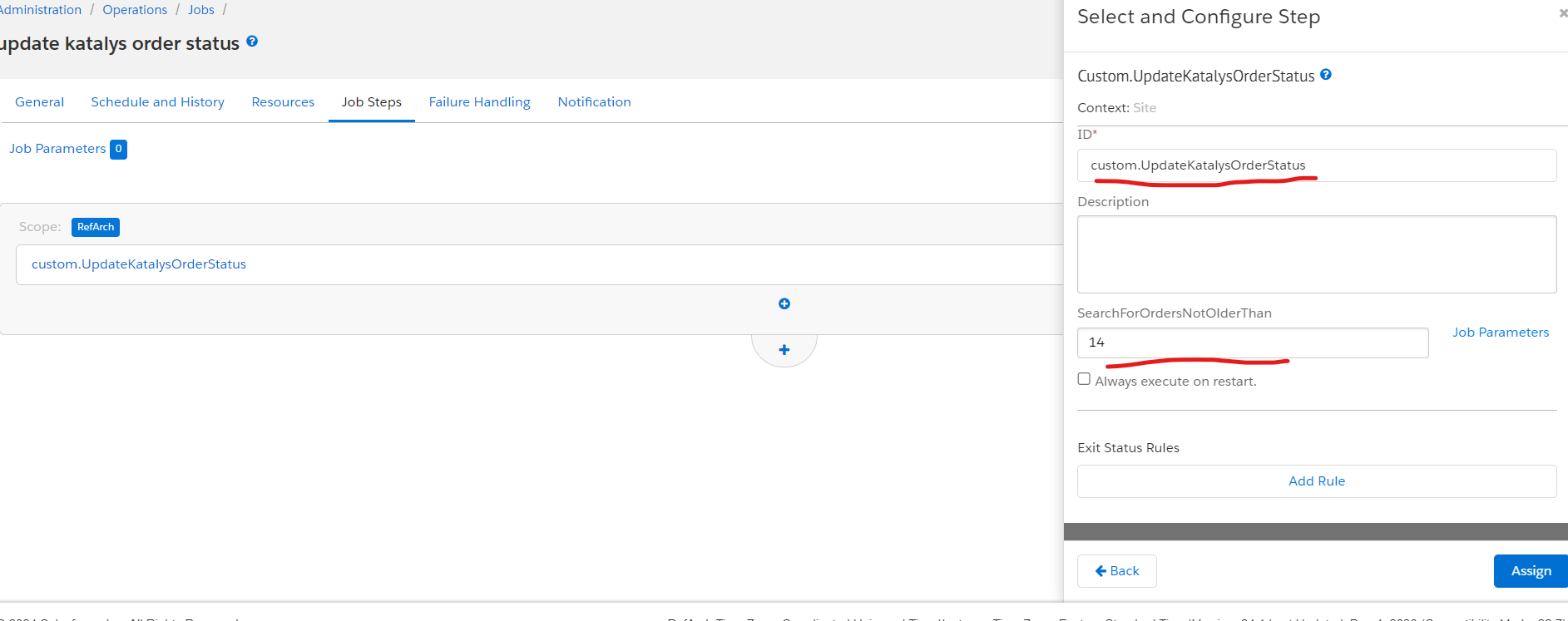 When the job is created, click on the job steps to add a step, in the step dialog search for custom.UpdateKatalysOrderStatus and select it and I give it an ID and provide a value for SearchForOrdersNotOlderThan. which specifies the date of orders the job should search for.