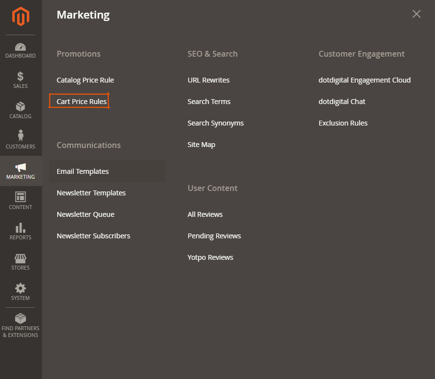 From the side navigation menu, select: Marketing → Promotions → Cart Price Rules