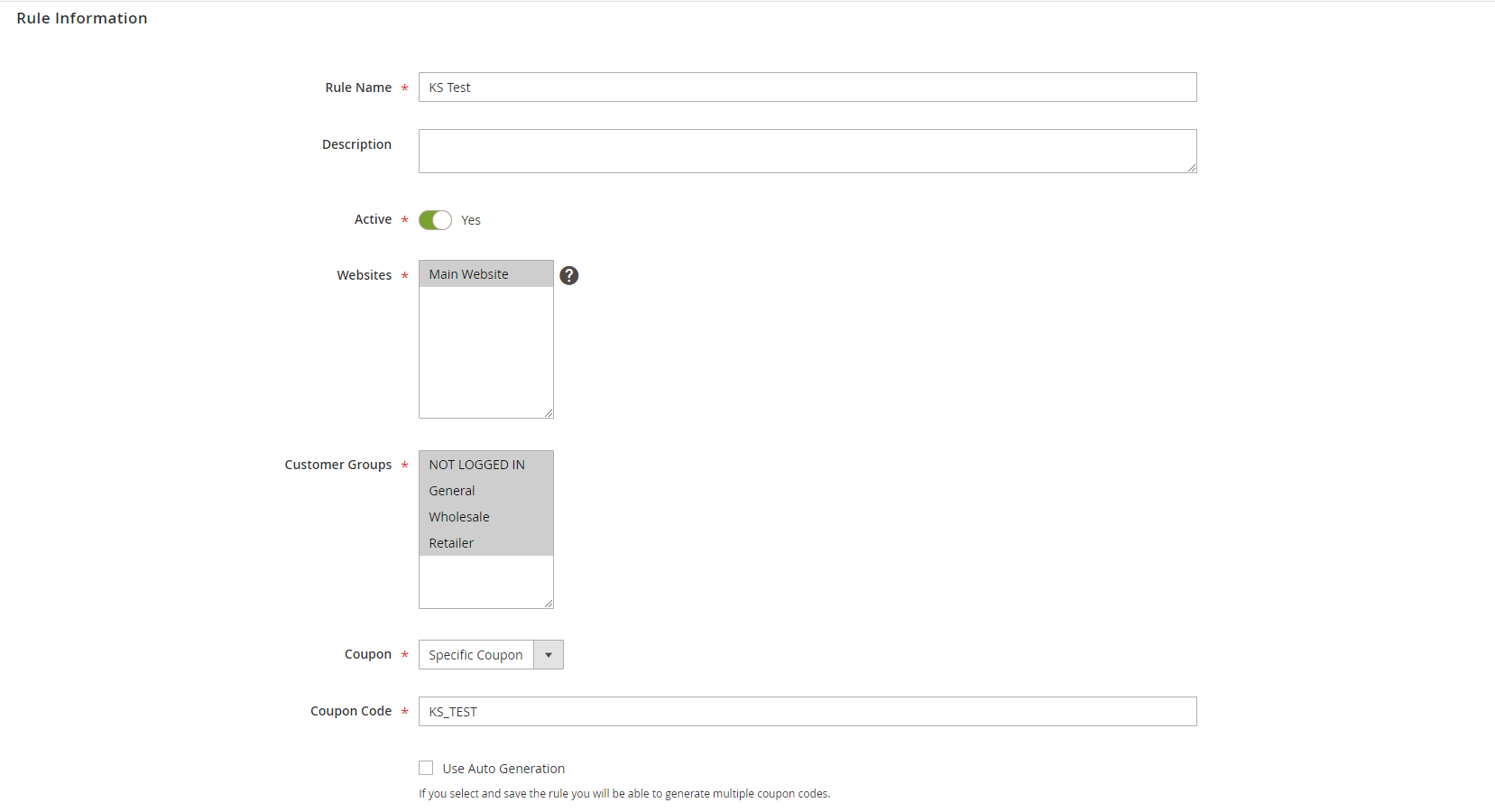Create the coupon using basic information (above), as is required ( Magento will not apply ).