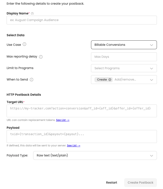 Max Reporting Delay - By defining this parameter, the postback will only be triggered if the time delay between click and conversion is less than this number of days. This may be important for media buying, when restricting audiences to just the most important traffic.