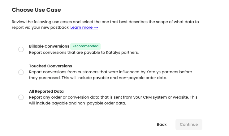 Payload: This optional field defines the data Katalys will send in the body of the postback request.