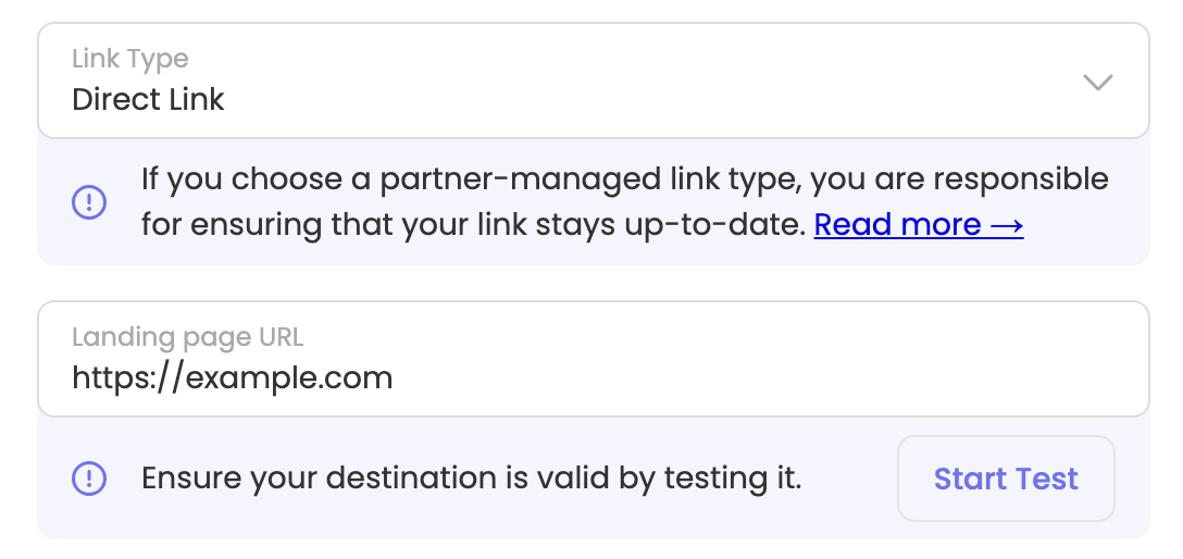 Direct Links should only be used when other types of tracking links are not available. Direct Links are brittle: they require special setup on the Advertiser’s website and may break if the Advertiser updates their funnel.