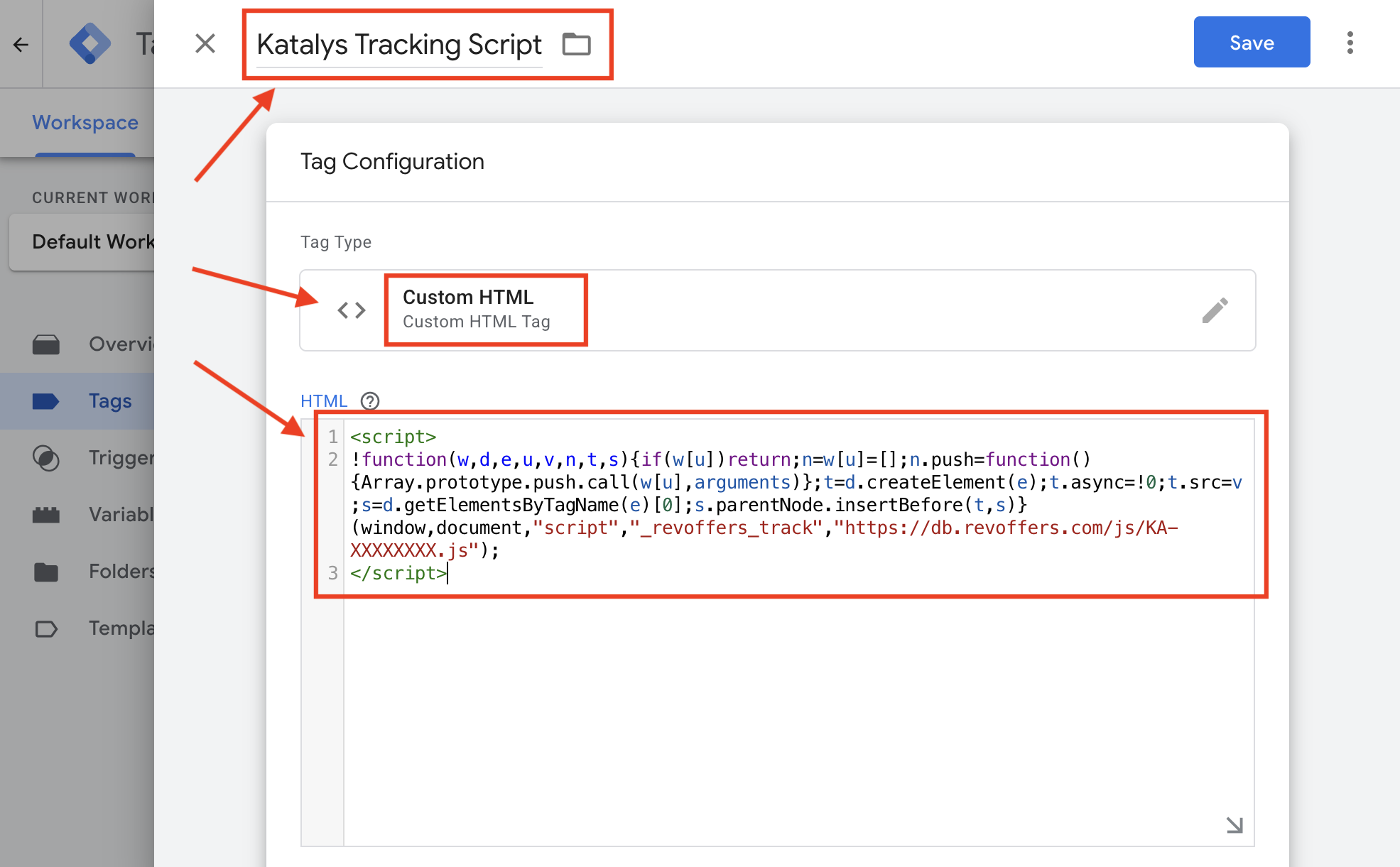 Name your tag “Katalys Tracking Script”. Click “Tag Configuration” to select the Tag Type and select “Custom HTML” for the Tag Type. Then paste your Katalys Tracking Script into the HTML field.