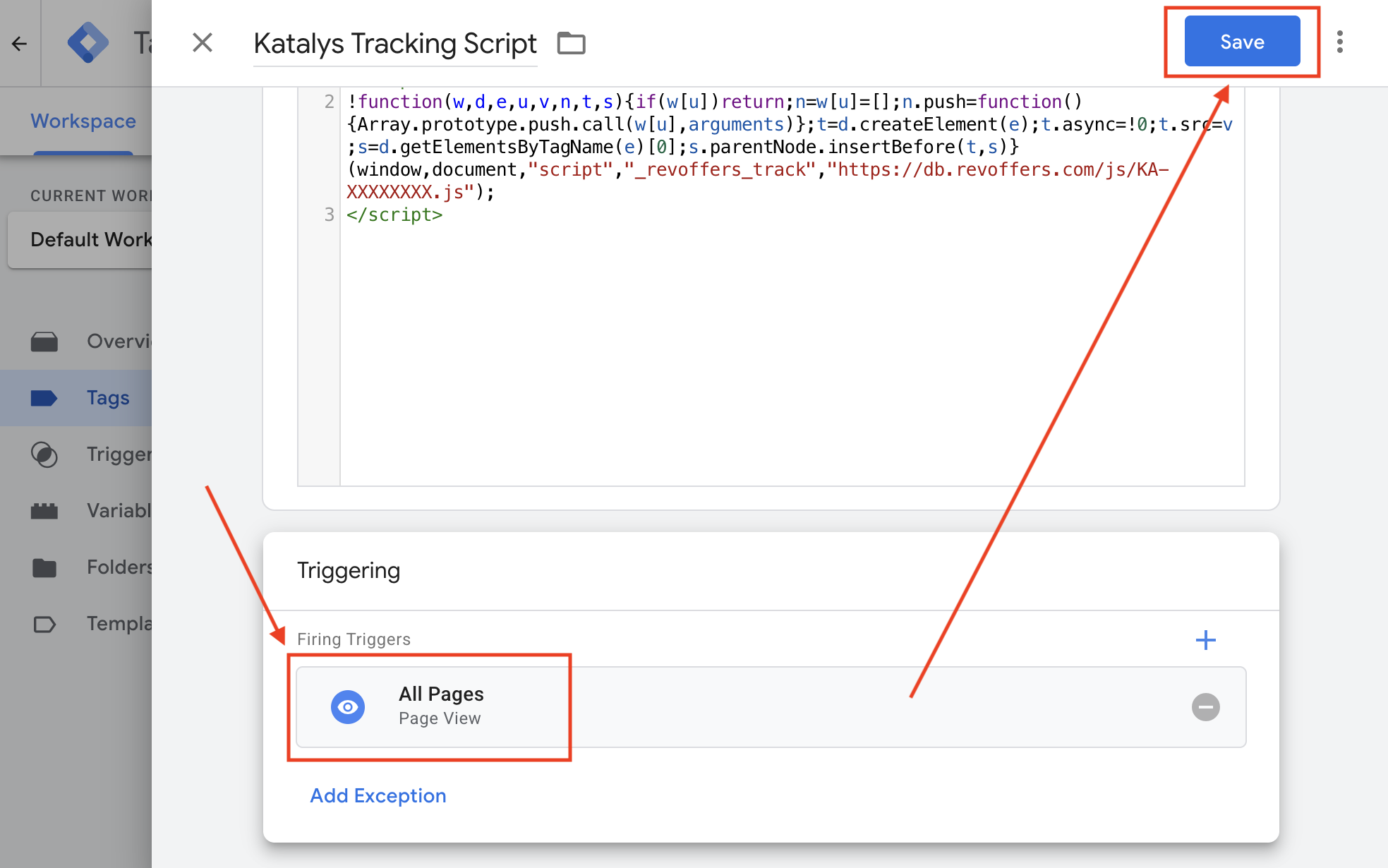 Scroll down and click “Triggering”. Select the “All Pages” Trigger of type “Page View”. Then click the ‘Save’ button to finalize the configuration.