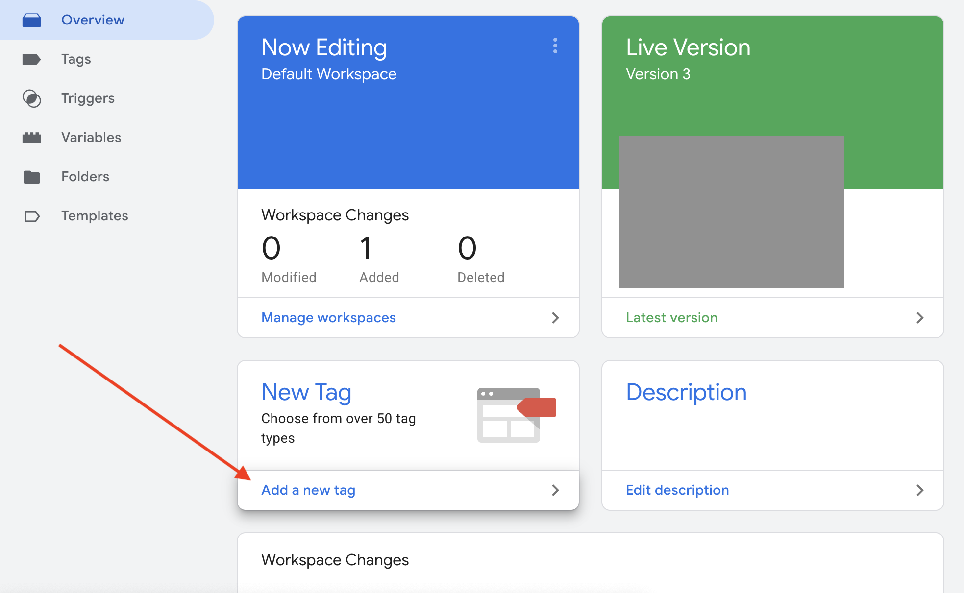 Go to your Google Tag Manager workspace and select the correct account and tag. Click “Add a new new tag”.