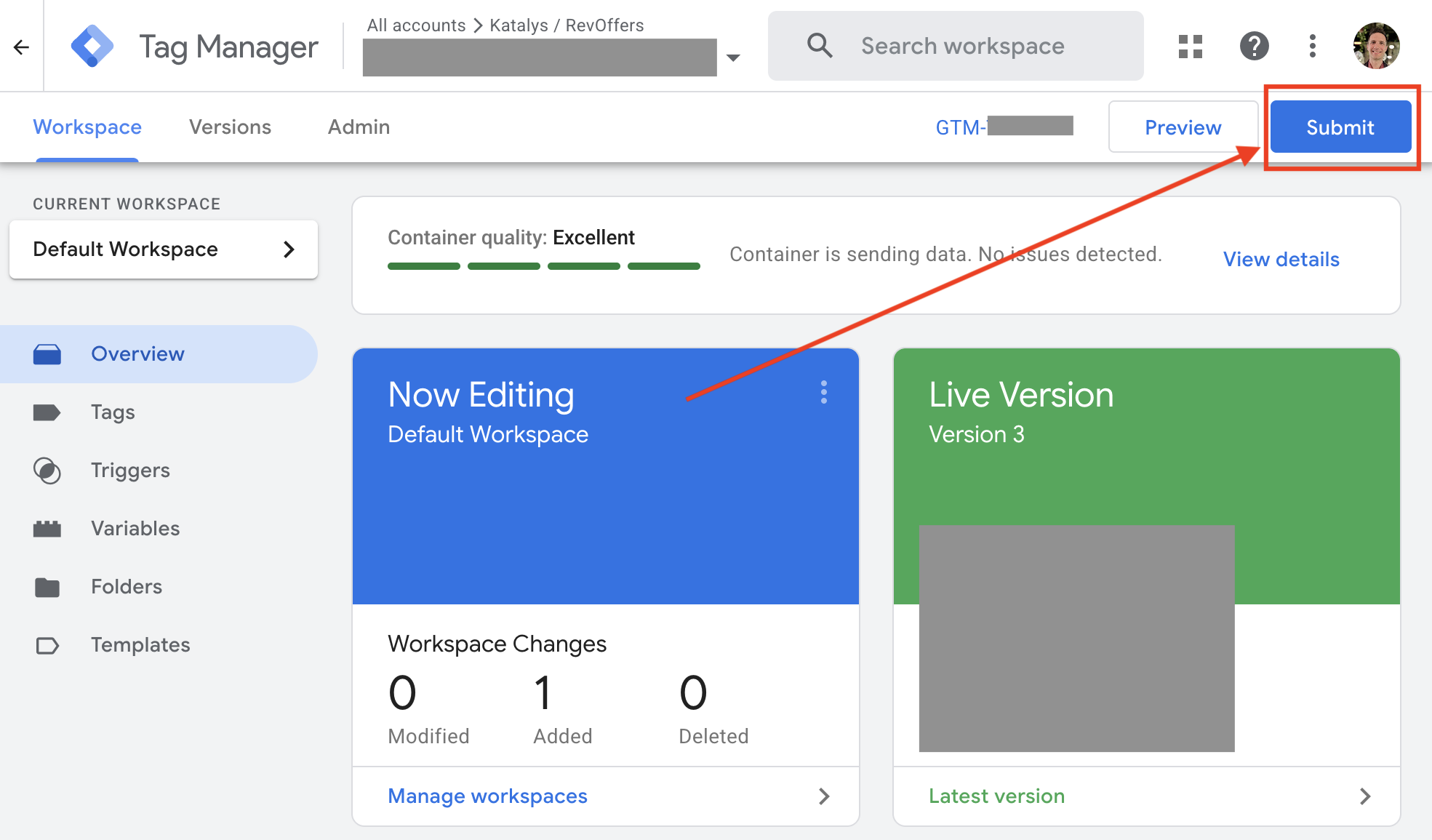 You can verify that the Katalys tag is firing by using the “Preview” link on your Google Tag Manager dashboard, loading your website, and ensuring the tag named “Katalys Tracking Script” is firing. You can further verify by following the instructions on the Landing Page Tracking documentation →
