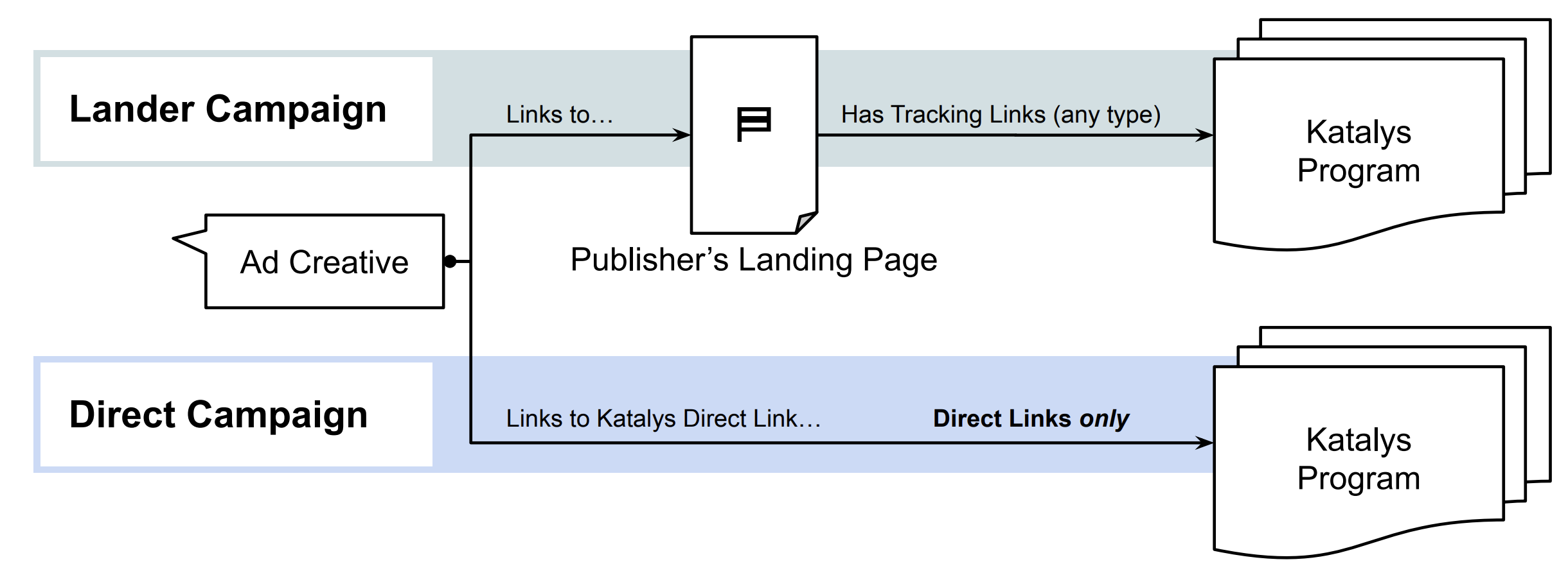 This page explains how to select appropriate tracking URLs when configuring paid campaigns. It covers 2 primary use cases: 1) linking to your own landing page (a Lander Campaign) or 2) linking directly to a Katalys brand (a Direct Campaign).