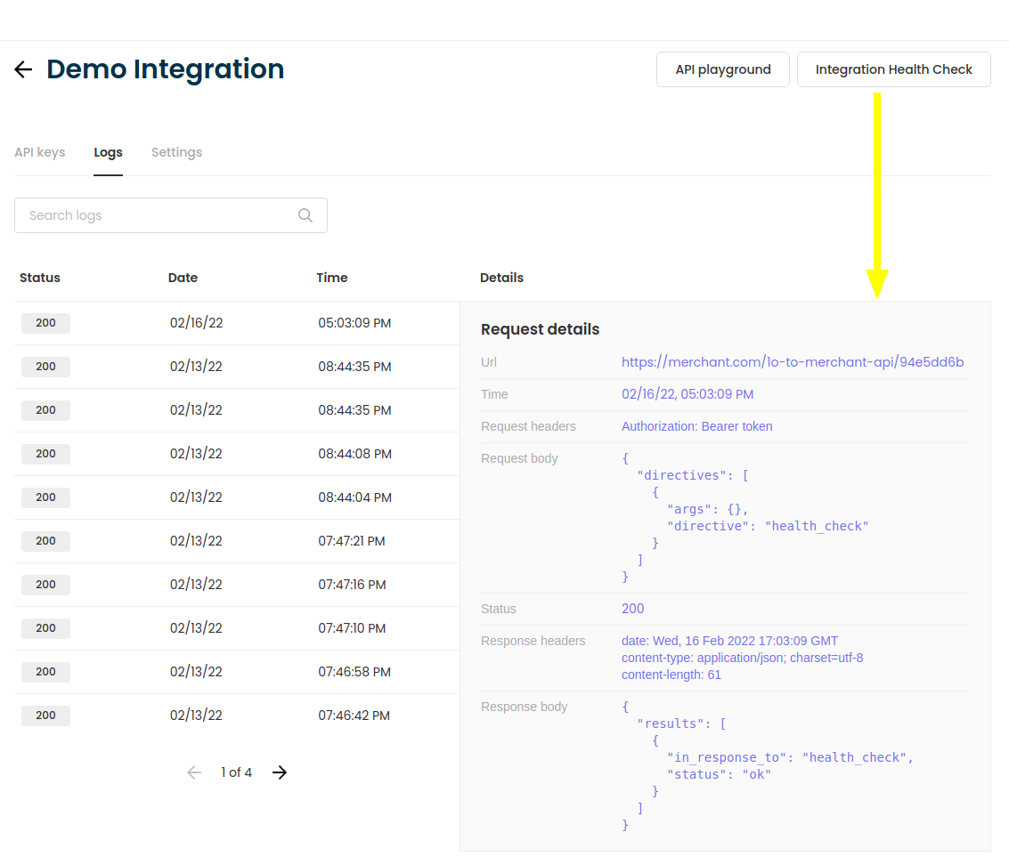 Health check is triggered from Katalys platform’s UI. It will send a health-check directive payload with a token to the integration’s URL. The integration is expected to verify the token first, then proceed to generate a token and make an authenticated request to Katalys’s API. If all of the above succeeds, we can consider the two systems connected.